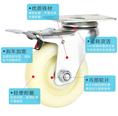 主要分為:塑料腳輪、尼龍腳輪、鋼鐵腳輪、耐高溫酚醛樹脂腳輪、橡版膠腳輪、PVC腳輪、TPE靜音腳輪等。另外除了主要的腳輪材質(zhì)之外,腳輪材質(zhì)還有鑄鐵鑄鋼、丁腈橡膠腳輪(NBR)、丁腈膠、天然橡膠腳輪、硅氟橡膠腳輪、氯丁橡膠腳輪、丁基橡膠腳輪、...